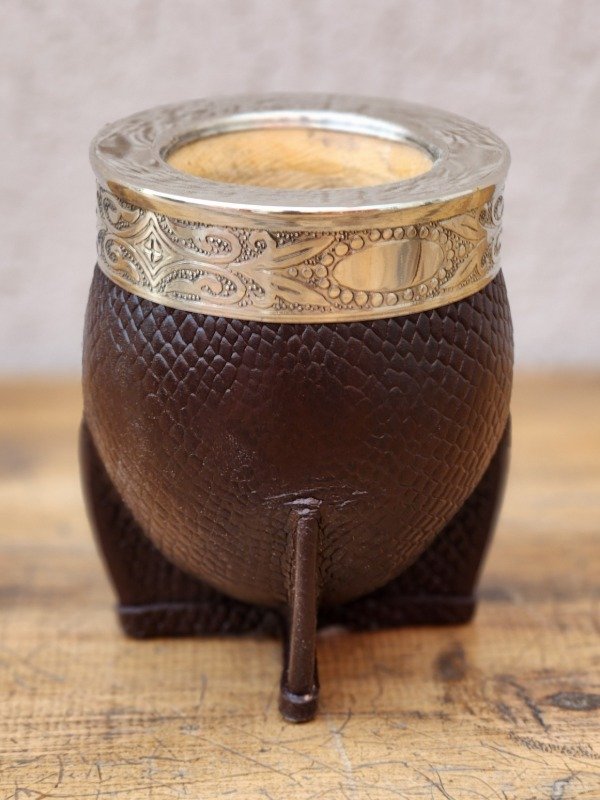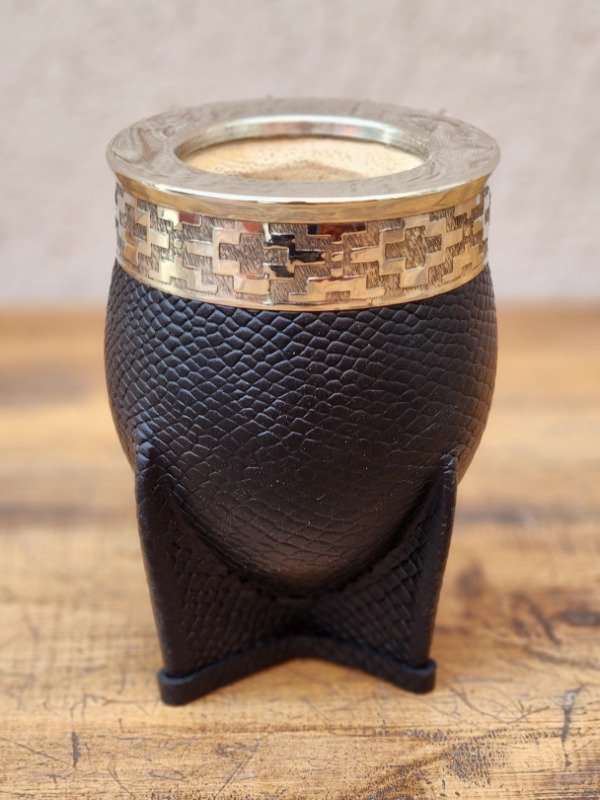 Un mate de belleza única, trabajado con dedicación en cada detalle de su elaboración. Su calabaza de pared gruesa y reforzada garantiza durabilidad, mientras que el cuero 100% croco realza su estética elegante y armoniosa.